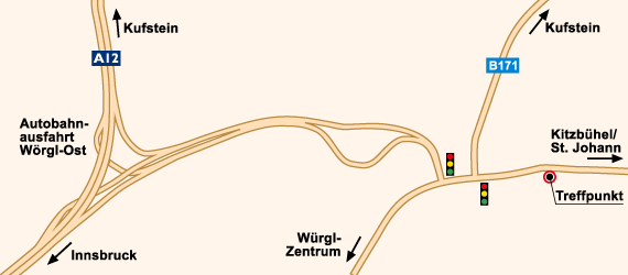 Aus Richtung Innsbruck: Auf der B171 bis Wörgl, Wörgl durchfahren (Achtung: Es gibt in Wörgl eine Abzweigung Richtung Kitzbühel, diese nicht nehmen, sondern geradeaus weiterfahren!), am Kreisverkehr geradeaus halten, ebenso beide folgenden Ampeln geradeaus (B178 Richtung Lofer / Kitzbühel / St. Johann). Nach ca. 200m kommt rechts das Autohaus Mazda Brunner. Kurz dahinter liegt der Firmenparkplatz, auf dem wir uns treffen.